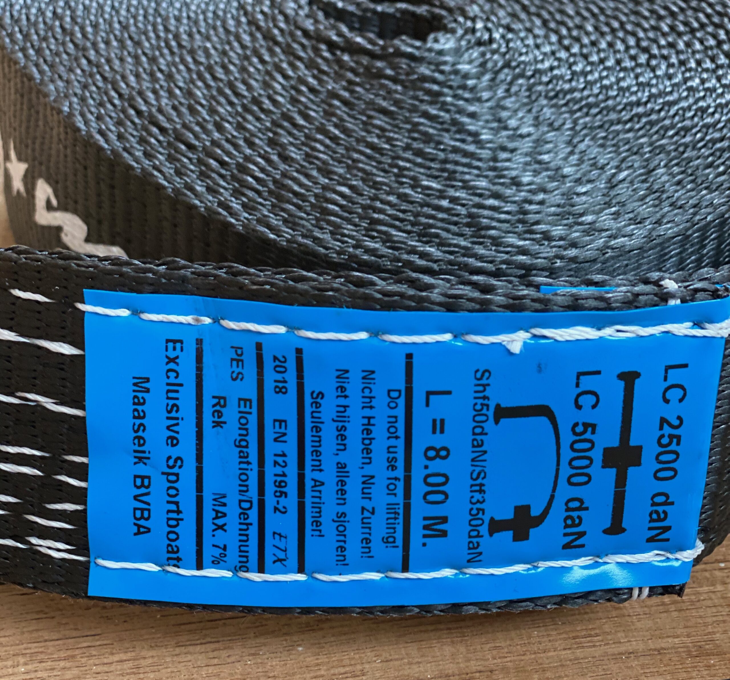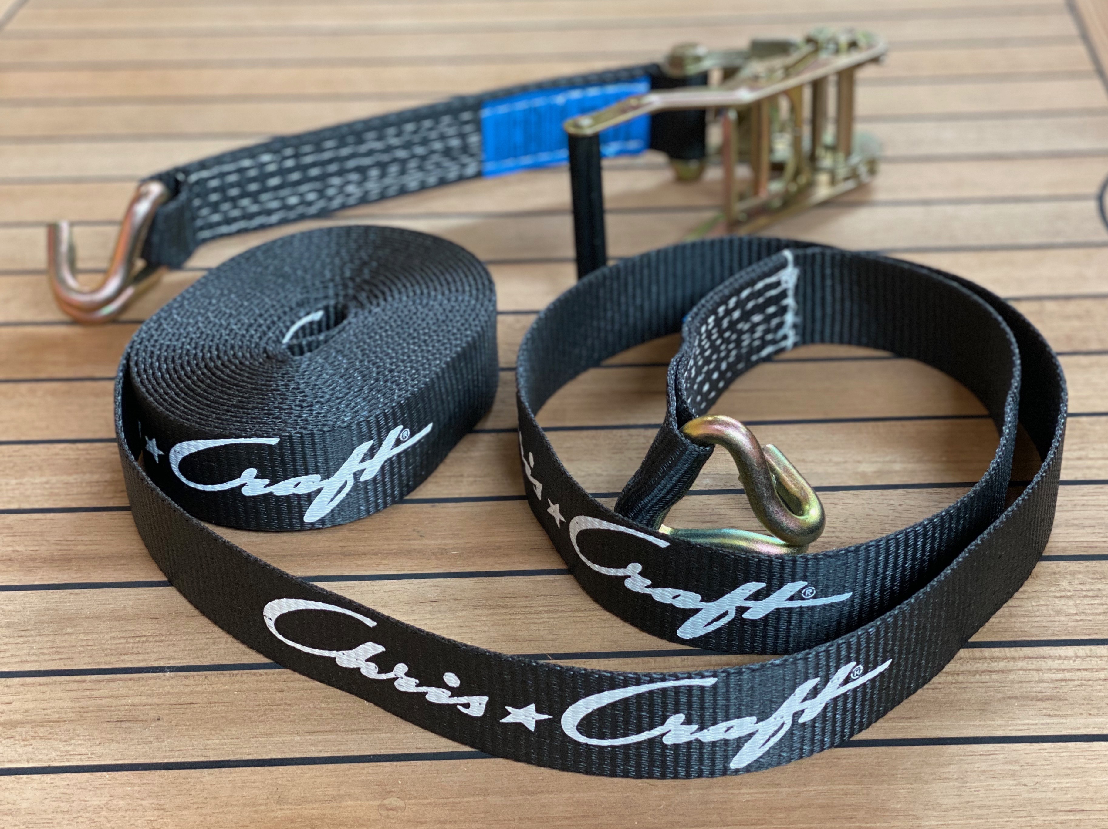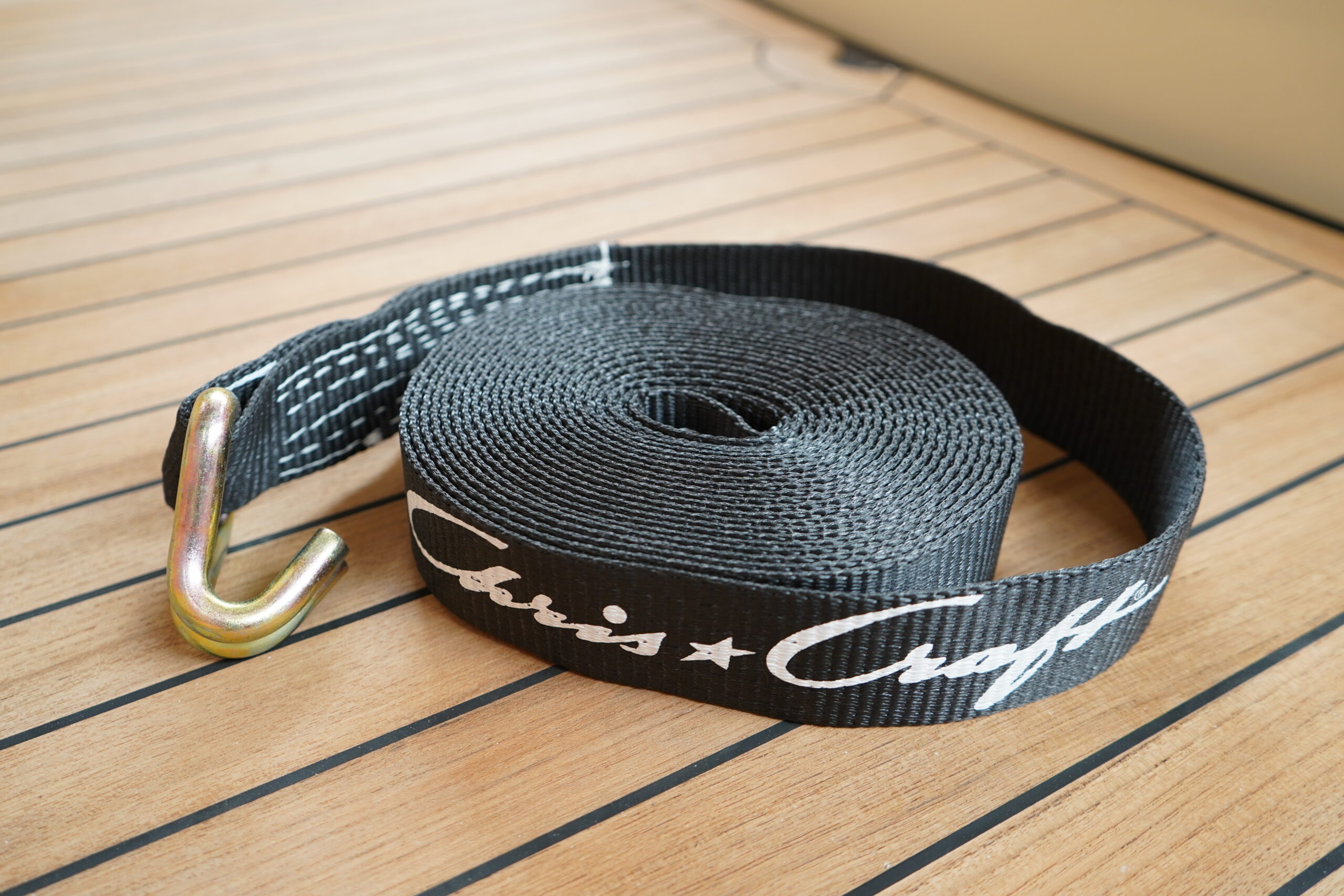 Deze tweedelige zwarte spanband/sjorband met CHRIS CRAFT logo is samengesteld uit hoogwaardig geweven polyester (PES) en heeft een lengte van 8,5 meter. De sterkte van de totale spanband betreft 5000 Kg. De labels worden standaard ingenaaid in de band en dat is uniek. Dit komt ten goede aan de kwaliteit en levensduur.