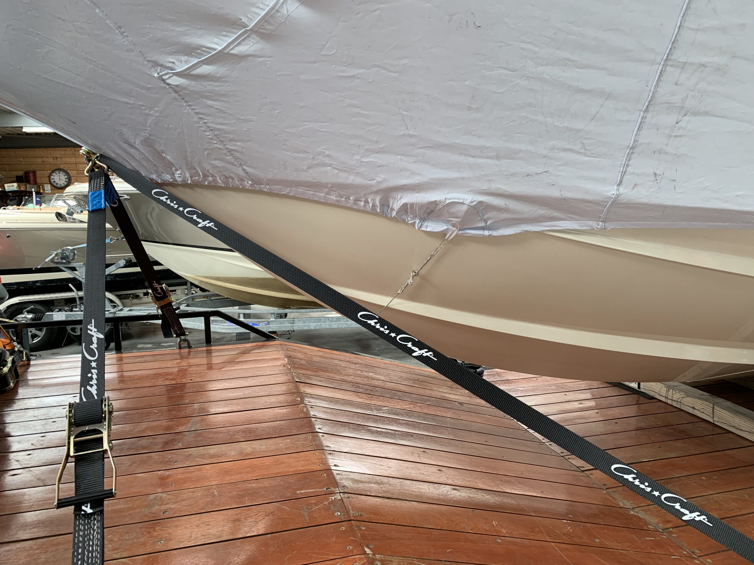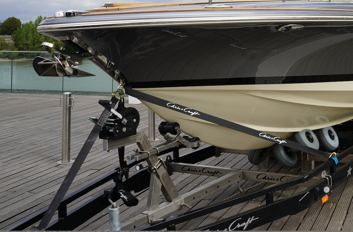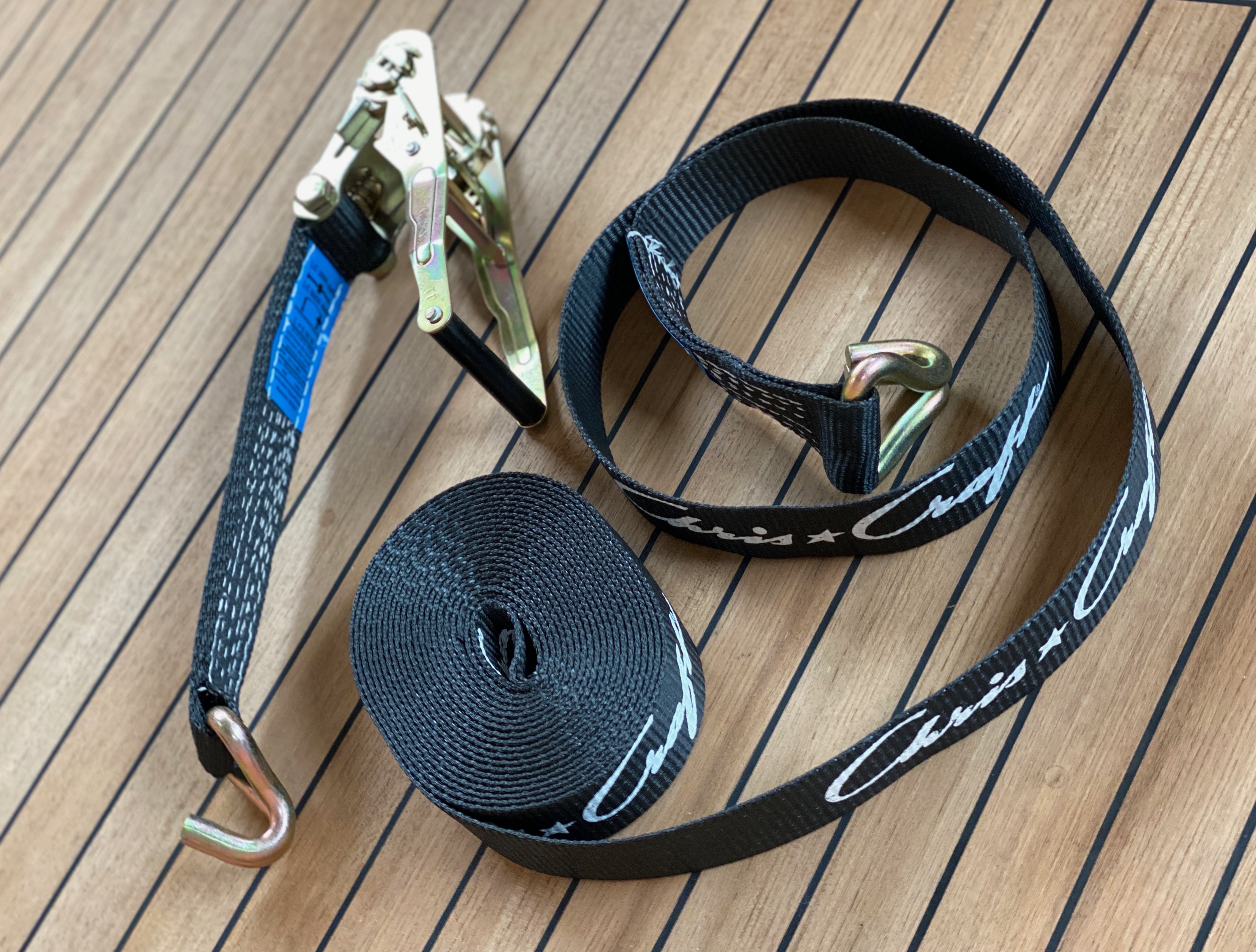 Deze tweedelige zwarte spanband/sjorband met CHRIS CRAFT logo is samengesteld uit hoogwaardig geweven polyester (PES) en heeft een lengte van 8,5 meter. De sterkte van de totale spanband betreft 5000 Kg. De labels worden standaard ingenaaid in de band en dat is uniek. Dit komt ten goede aan de kwaliteit en levensduur.